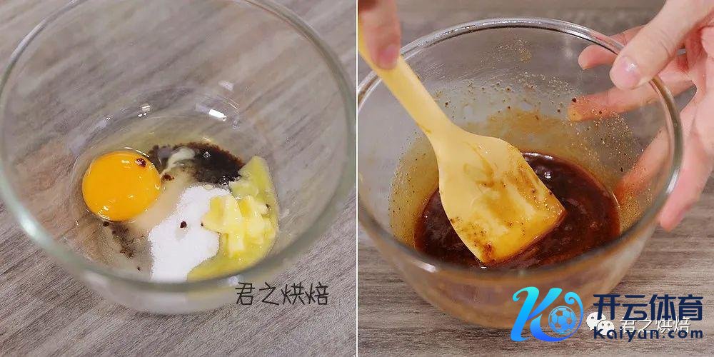 在一个碗里夹杂鸡蛋、红糖、细砂糖、黄油(软化或溶化成液态)。用刮刀搅动均匀,使它们充分夹杂。