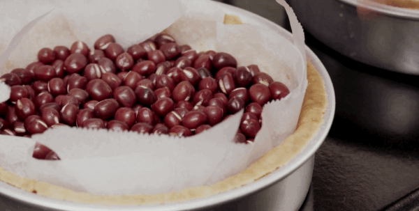 在挞皮里铺一张剪辑好的油纸,然后放入干净的石子或豆子等重物。放入烤箱中层坎坷火180℃烘烤15分钟傍边,至挞皮微金黄色。