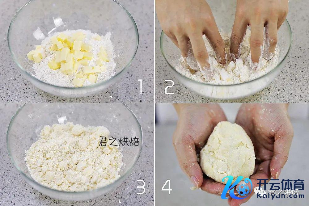 黄油切成小丁(不需要软化),和低筋面粉夹杂在一说念(图1)。 用手不休的抓握面粉,使面粉和黄油充分夹杂(图2)。