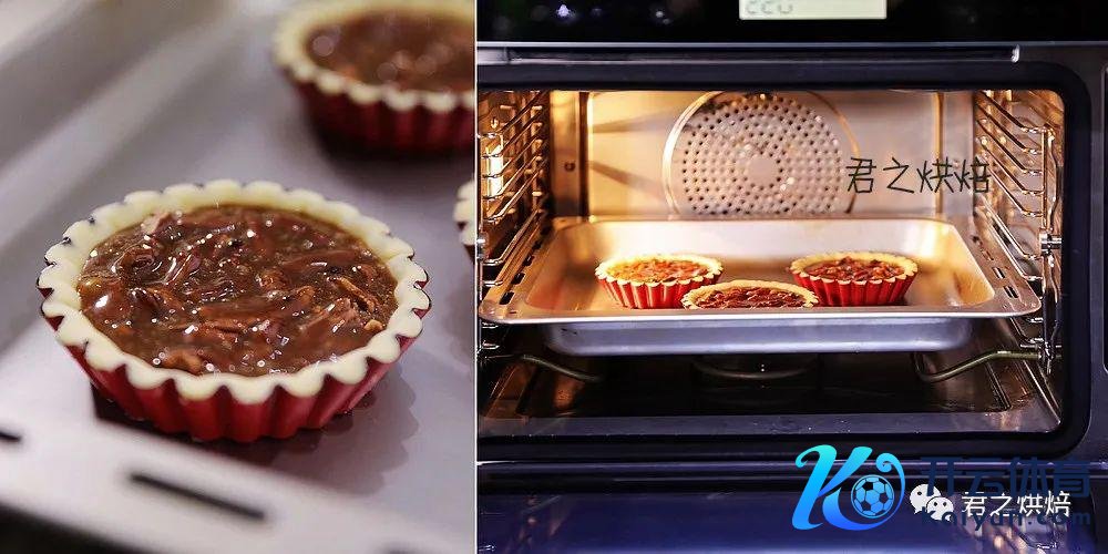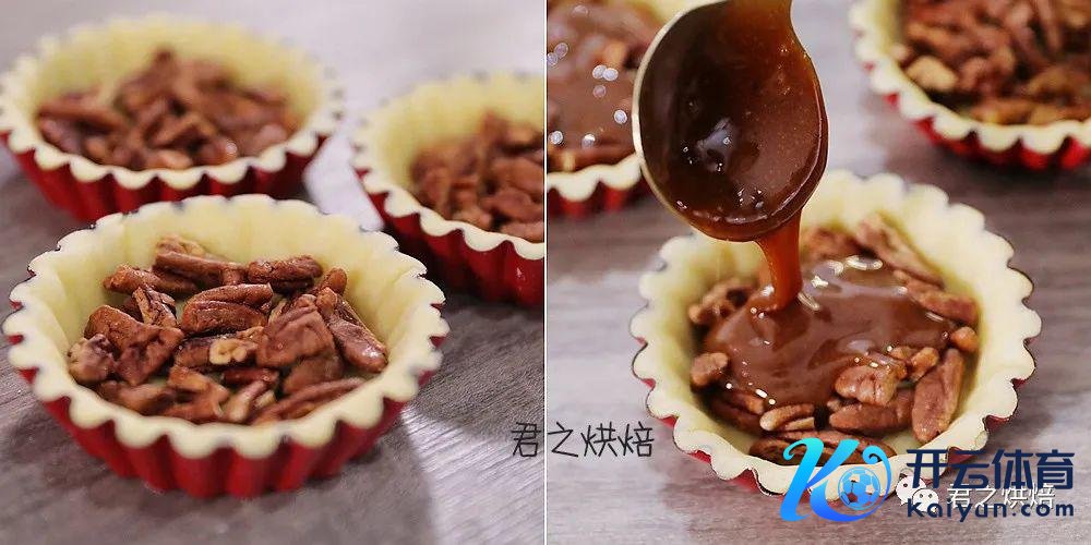 烤好以后,将油纸连同豆子一说念取出。在挞底放入碧根果仁,倒入蛋糖液,进行烘烤即可(无需用220℃高温,告成用坎坷火175℃,烤25-30分钟,烤到挞馅充分饱读起即可)。