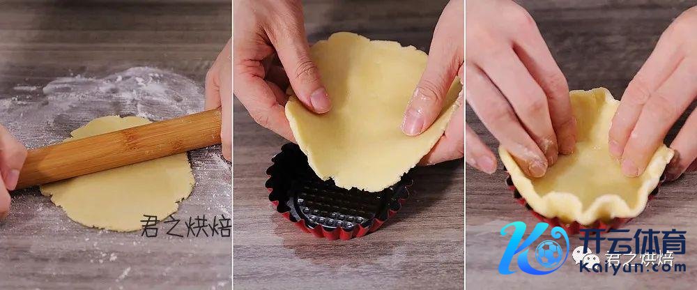 将挞皮分红3份。案板上撒干面粉防粘,取一份挞皮,压扁并擀开,使它足够大到正巧不错放入一个4寸的挞模里。将挞皮放入挞模,用手轻压,使挞皮贴合挞模的方法。