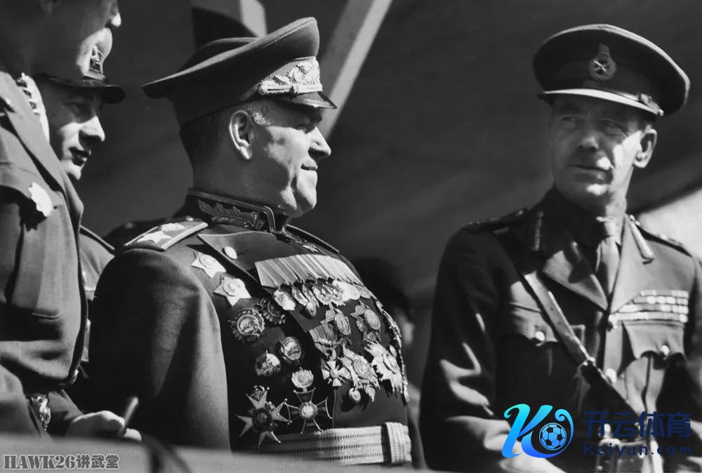 朱可夫元戎佩带沿途勋章盛装出席,比拟之下,好意思英法将军们简朴的军装和小小的勋略有些寒酸的滋味。虽然,这亦然英好意思法预先收场的共鸣,他们试图以燕服出席的面目裁汰这次雠校式的规格,但成果自欺欺人。朱可夫这位“得胜元戎”向好意思国、英国和法国展现了他的雄健威望和弘远的钢铁军队,这看起来极具标记兴致。