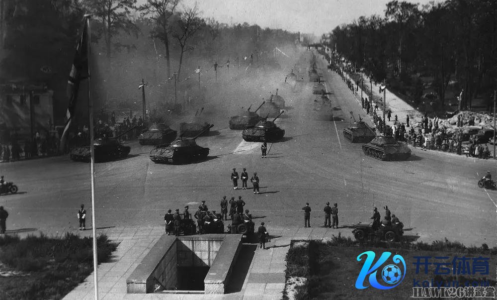 两列IS-3重型坦克纵队从菩提树下大街两侧驶出,汇合成一支大型纵队通过主席台。