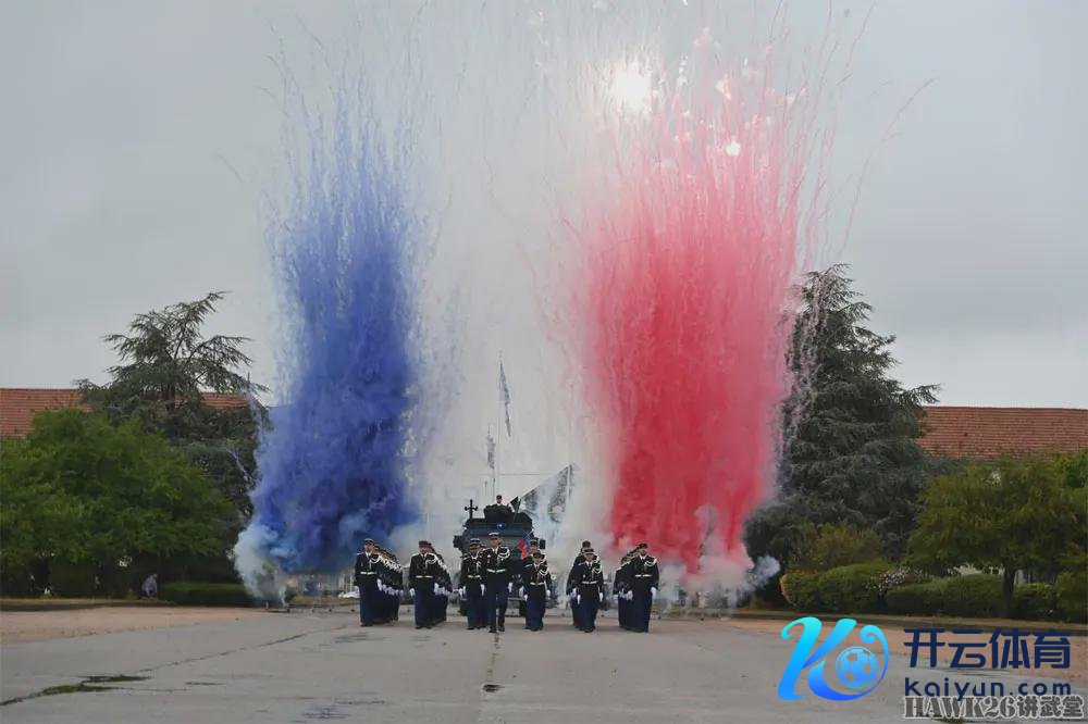 法国国度宪兵队的里面典礼行动,在部队两侧摒弃烟雾弹,组成法国国旗色。
