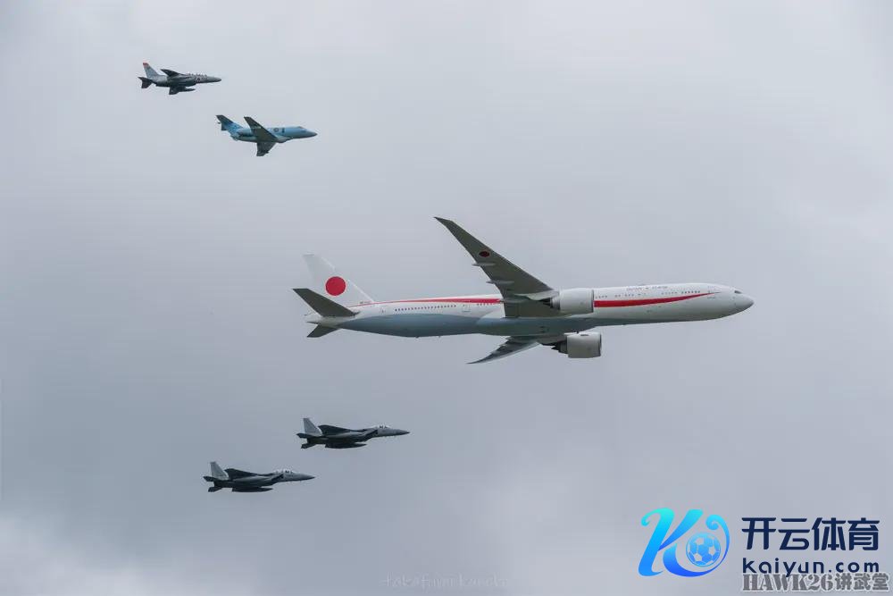 日本航空自保队进行异种机编队飞翔磨练,长机为波音777日本政府公事机,其左侧为两架F-15J斗争机,右侧为一架公事机和一架T-4说明注解机。